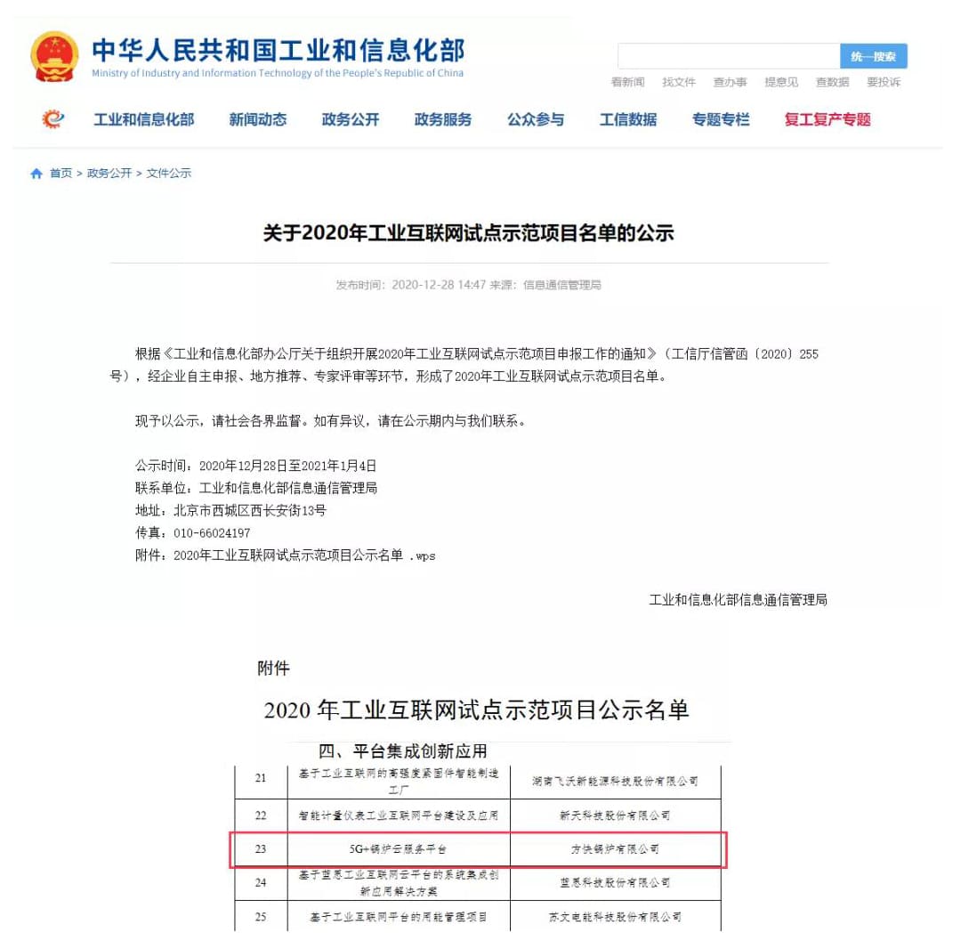 12月28日,由國家工信部公示了2020年工業互聯網試點示范項目名單。方快鍋爐有限公司申報的“5G+鍋爐云服務平臺項目”憑借過硬的技術平臺和超前的行業運作模式成功入圍。