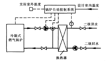 鍋爐自動控制系統根據設計室內溫度及實際室外溫度計算出二級供水溫度,將計算二級供水溫度與實際二級供水溫度進行比較,由鍋爐自動控制系統控制鍋爐的熱功率,使得實際二級供水溫度接近計算二級供水溫度。