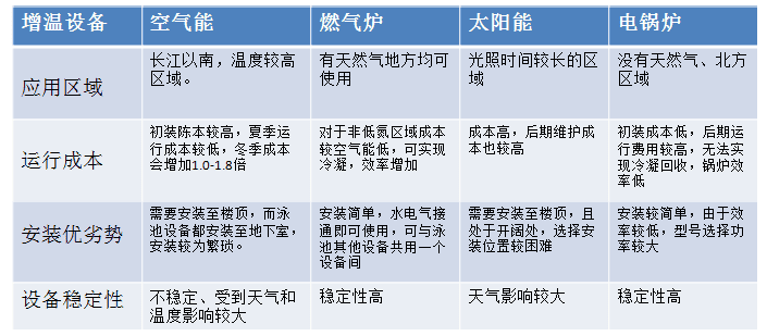 在泳池增溫系統中主要用到太陽能、空氣能、商用燃氣鍋爐、電鍋爐四種增溫設備