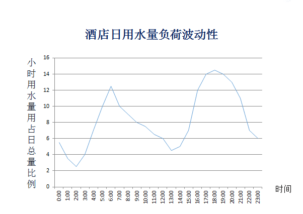 由于經濟型酒店以客房服務為主的特點,以及入住率的影響,導致酒店全天的熱水用量負荷波動較大,用水較為集中,會出現兩個高峰階段(早高峰、晚高峰),高峰用水量占總用水量的 70%~80% 。